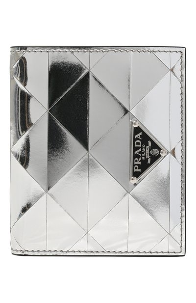 Знаковая для бренда треугольная эмблема вдохновила дизайнеров на создание тисненого геометрического орнамента, которым украсили серебристое портмоне. Мастера марки сшили модель из мягкой кожи с зеркальным блеском, а для отделки внутри использовали черный матовый материал. Помимо отделения для банкнот в аксессуаре предусмотрели восемь слотов для пластиковых карт.
