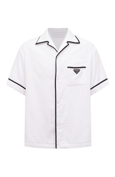 Обычно рубашки шьют из тонкой ткани, но для этой белоснежной модели Миучча Прада и Раф Симонс выбрали махровый материал. Несмотря на плотность он хорошо пропускает воздух, поэтому в изделии будет комфортно в жару. Однотонную модель дизайнеры сделали графичнее с помощью черного канта. С ним перекликается треугольный патч, которым выделили нагрудный карман.