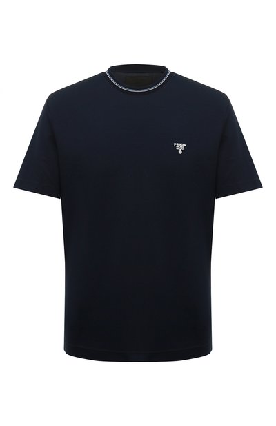 Темно-синюю футболку выполнили из мягкого тонкого хлопка с длинными волокнами, которые эффективно пропускают воздух. Чтобы модель лучше тянулась, в состав включили эластан. Деликатные акценты в изделии расставили узкими полосами у круглого выреза, поддержав их цвет небольшой брендированной вышивкой с переди.