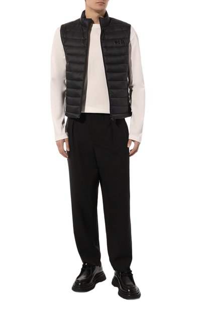 Мастера марки использовали для пошива стеганого жилета прочный нейлон с неброским шелковистым блеском. Такой невесомый материал не боится дождя и хорошо защищает от ветра, а тонкий слой утеплителя согревает в непогоду и не утяжеляет модель с воротн иком-стойкой. Принадлежность бренду обозначили матовым логотипом спереди.