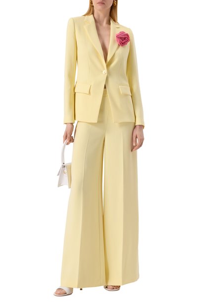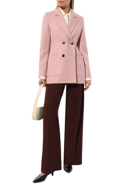 Строгий крой этого прямого однобортного пиджака дизайнер марки смягчила пастельным розовым оттенком, словно позаимствованным у клубничной пастилы. В такой нежный цвет окрасили легкую шелковистую вискозу, из которой сшили модель с акцентированной линией плеч и заостренными лацканами. Чтобы сделать ткань прочнее, в ее состав включили тонкие волокна полиэстера.