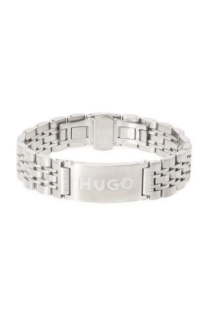 Принадлежность широкого серебристого браслета марке обозначили тисненым логотипом, которым украсили центральный элемент. Для изготовления аксессуара, напоминающего ремешок для часов, использовали прочную сталь, отполированную до матового блеска.