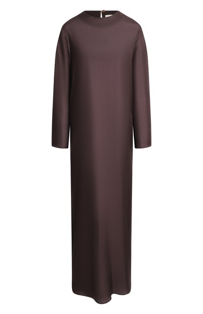 Прямой крой, чистый цвет и полное отсутствие декора: длинное платье оттенка горького шоколада получилось предельно лаконичным. Для пошива свободного изделия со слегка спущ енной линией плеч дизайнер марки выбрала тончайший полупрозрачный шелк, который нежно касается кожи, а в движении словно обтекает фигуру.