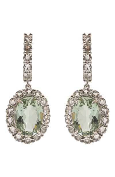 Небольшие серьги из серебра 925 пробы с родиевым покрытием усыпаны прозрачными белыми топазами. Их холодное сияние усиливает блеск овального бледно-зеленого аметиста в центре подвижной подвески. Этот крупный камень закрепили так, чтобы лучи света проходили сквозь него, преломляясь на гранях и создавая эффект мерцания.