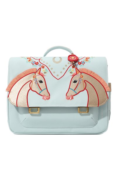 Голубой вместительный портфель из легкого, но прочного непромокаемого текстиля с тефлоновым покрытием подойдет для школьника в возрасте от шести до восьми лет. Чтобы правильно распределить нагрузку на плечи и спину, аксессуар дополнили широкими мягкими ремнями и эргономичной задней панелью из гибкого полимера EVA. Откидной клапан с ярким декором в виде лошадей застегивается и расстегивается на магнитные замки простым нажатием.