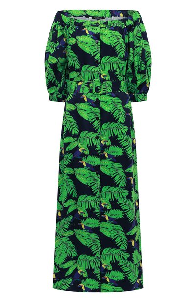 Для пошива миди-платья с пуговицами по всей длине спереди Юлия Янина выбрала тонкий дышащий хлопок с сочным тропическим принтом. Объемные рукава 3/4 и открытая линия плеч, демонстрирующая королевскую осанку и хрупкие ключицы, делают модель женственнее. Поддерживают впечатление расклешенный подол и широкий пояс, формирующий приталенный силуэт.