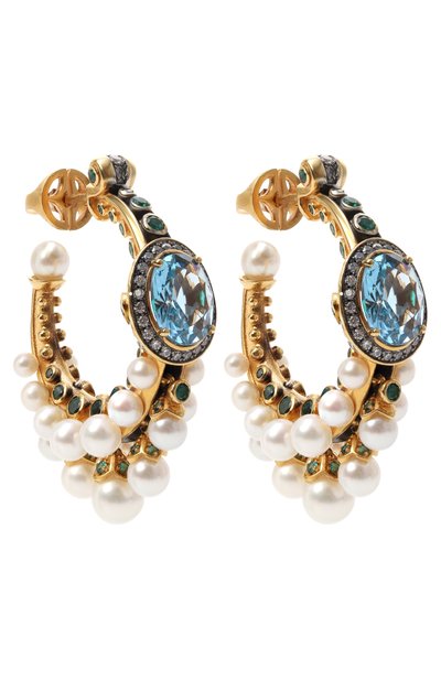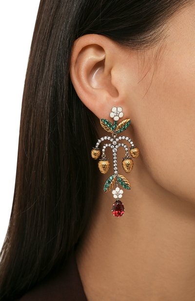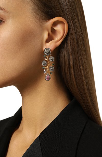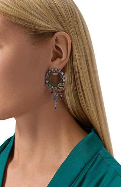 Серьги Skeletons с застежками-пусетами выполнили из родированного серебра 925-й пробы. Подвижные шандельеры в форме скелетов инкрустировали турмалинами параиба и фианитами.