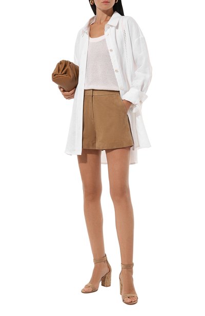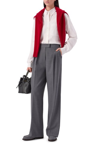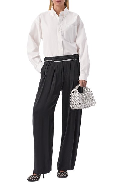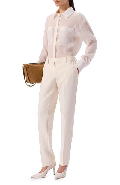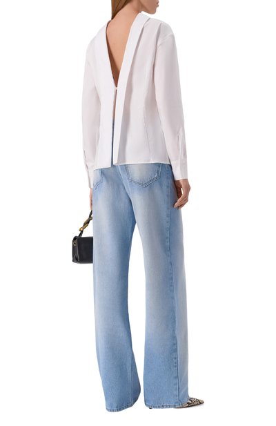 Рубашку чистого белого цвета будто позаимствовали в мужском гардеробе. Такую иллюзию формирует удлиненный свободный крой со сп ущенной линией плеч и воротником кент. Для пошива однотонной модели с длинными рукавами Миучча Прада и Раф Симонс выбрали тонкую мягкую хлопковую ткань, которая особенно приятна на ощупь.