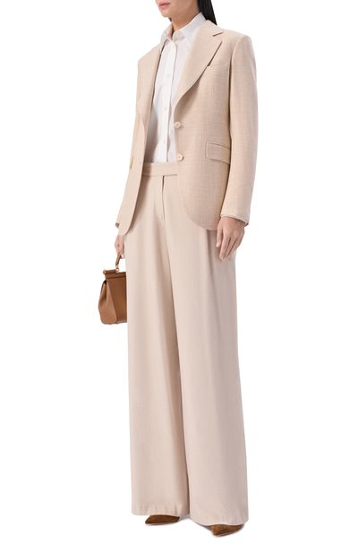 Рубашку чистого белого цвета будто позаимствовали в мужском гардеробе. Такую иллюзию формирует удлиненный свободный крой со спущенной линией плеч и воротником кент. Для пошива однотонной модели с длинными рукавами Миучча Прада и Раф Симонс выбрали тонкую мягкую хлопковую ткань, которая особенно приятна на ощупь.