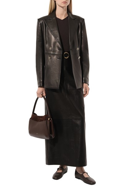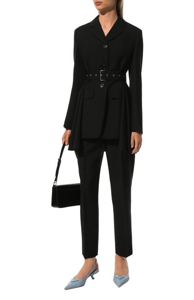 Черный двубортный блейзер с атласными широкими лацканами, как у смокинга, акцентированными плечами, широким поясом и четырьмя карманами идеально садится по фигуре благодаря исключительному уровню конструирования и соединения деталей. Миучча Прада и Раф Симонс выбрали для пошива модели мягкую полушерстяную ткань с добавлением нежных волокон мохера.