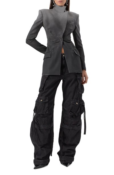Серый однобортный блейзер с широкими лацканами, врезными карманами и складками по бокам добавит образу асимметрии. Для пошива модели с удлиненной спинкой Миучча Прада и Раф Симонс выбрали тонкую гладкую шерсть. Приталенный силуэт формирует съемный пояс с люверсами и крупной пряжкой, как у тренча.