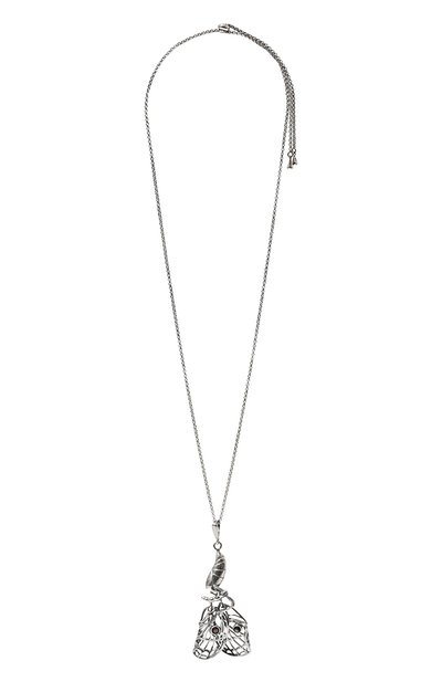 Крупный ажурный кулон выполнили в виде бабочки, только что покинувшей кокон. Модель закрепили на тонкой цепочке, длину которой можно регулировать скользящим фиксатором. Для изготовления аксессуара, инкрустированного для реалистичности глянцевыми кабошонами, мастера марки использовали полированный серебристый металл.