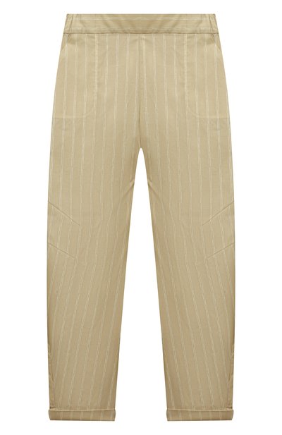 Для изготовления бежевых брюк использовали мягкий тонкий хлопок. Легкий материал соткали из прочных волокон премиального хлопка, который при плетении создает гладкую текстуру с шелковистым блеском. В широкий пояс вставили эластичную ленту, поэтому модель комфортно облегает талию.