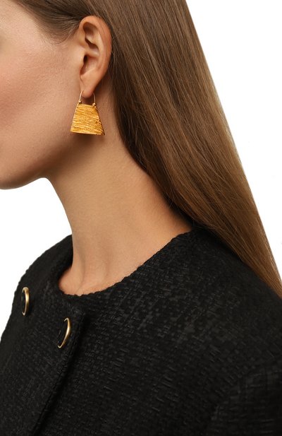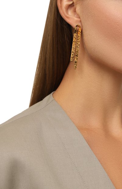 Незамкнутые серьги-кольца Drowning to Embrace выполнили в форме крыльев с детализированным рельефным узором. Аксессуар с застежками-пусетами изготовлен из позолоченной латуни.