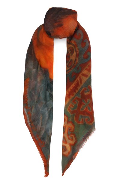 Разноцветную шаль украсили крупным изображением цветка мака, фоном для которого стал орнамент в восточном стиле. Мотив, словно нарисованный яркими красками, сделает аксессуар акцентной деталью образа. Для изготовления модели использовали тончайший нежный кашемир, поэтому она не будет выглядеть объемной, даже если ее несколько раз сложить и заправить под пальто.