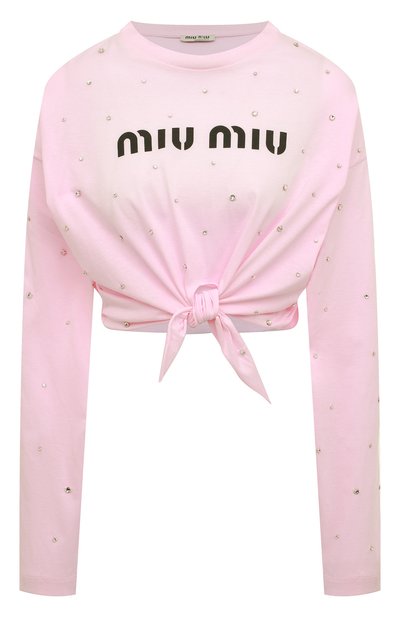Мастера марки сшили розовый лонгслив, завязывающийся объемным узлом на талии, из тонкого хлопкового трикотажа, хорошо пропускающего воздух. Укороченную модель со спущенной линией плеч декорировали черным принтом в виде логотипа бренда и множеством прозрачных крис таллов. Наши стилисты предлагают носить такое изделие с джинсовыми шортами и кроссовками.