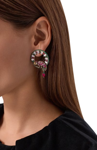 Главную роль в сложносочиненной композиции на этих серьгах отдали деталям в виде обезьян, которых окружили цветочными лианами. Для изготовления модели использовали серебро 925 пробы. Украшение декорировали мерцающими наноизумрудами, фианитами и перламутровыми жемчужинами.