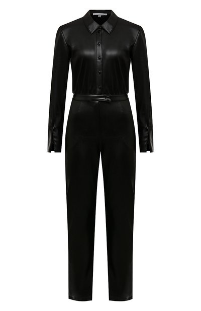 Патриция Бамби стилизовала комбинезон под комплект, состоящий из рубашки с вырезами на манжетах и прямых брюк с высокой посадкой. Его черный цвет получился выразительнее благодаря материалу. Для пошива модели использовали мягкую глянцевую экокожу, которая слегка тянется, не сковывая движения.