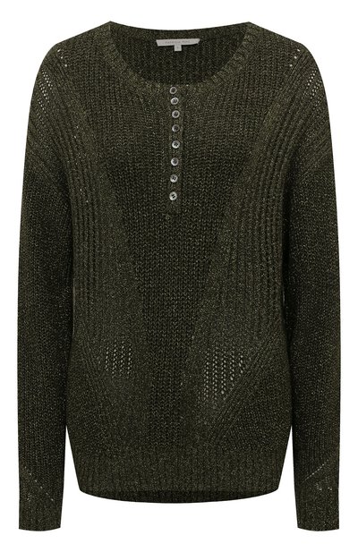 Темно-зеленый свитер мерцает при движении благодаря люрексу в составе нежной пряжи на основе шелковистой вискозы. Усиливает эффект фактурный узор, создающий на модели геометрическую композицию. В нее вписывается планка с пуговицами под круглым вырезом.