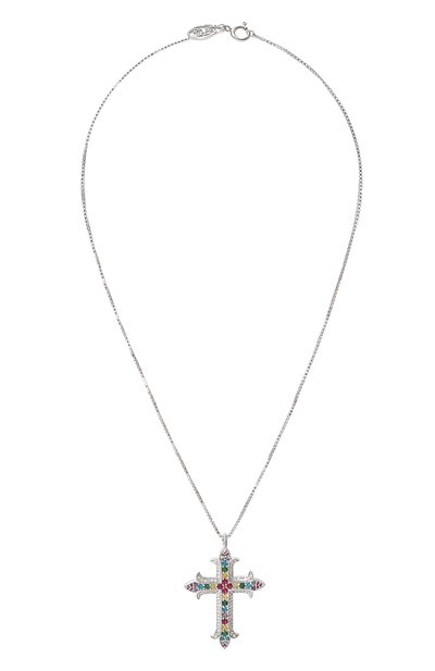 Мастера марки выполнили подвеску в форме креста из легкого ювелирного сплава. Блеск серебристого покрытия эффектно перекликается с сиянием разноцветных миниатюрных кристаллов, подчеркивающих плавные линии украшения. В комплекте — тонкая цепочка панцирного плетения.