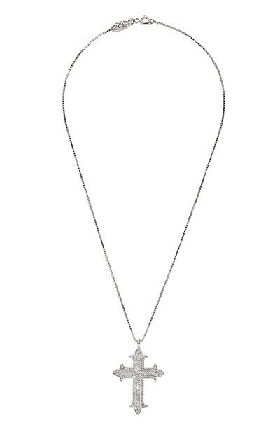 Для изготовления крупного кулона в виде фигурного креста мастера марки использовали полированный серебристый сплав. Холодный блеск металла усиливает сияние полупрозрачных кристаллов, которыми полностью покрыли аксессуар. В комплекте – тонкая ажурная цепочка с карабином.