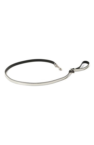 Мастера марки выполнили узкий поводок из мягкой плотной кожи с металлизированным серебристым покрытием. Чтобы аксессуар было удобно держать в ладони, его дополнили ручкой-петлей из такого же материала. Детали соединили небольшой подвеской со знаковой треугольной эмблемой бренда.