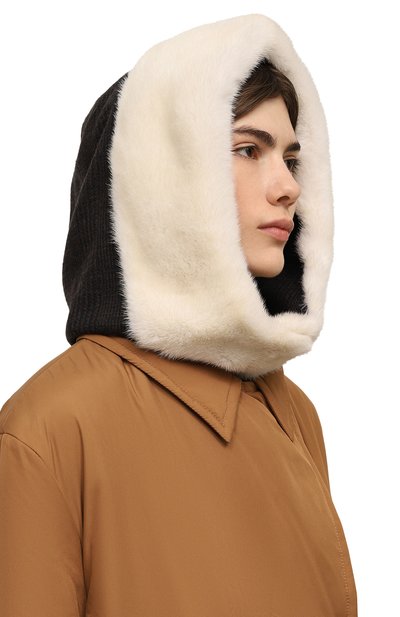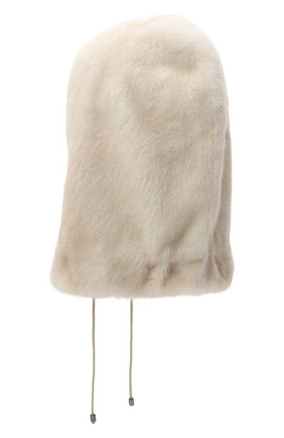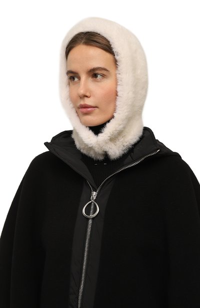 Для изготовления белого капюшона мастера марки использовали пушистый легкий мех норки. Шкурки тщательно отобрали по густоте подпушка, а узкие детали из них переплели так, чтобы создать деликатный узор. Аксессуар хорошо удерживает тепло и защищает от ветра, не перегревая.