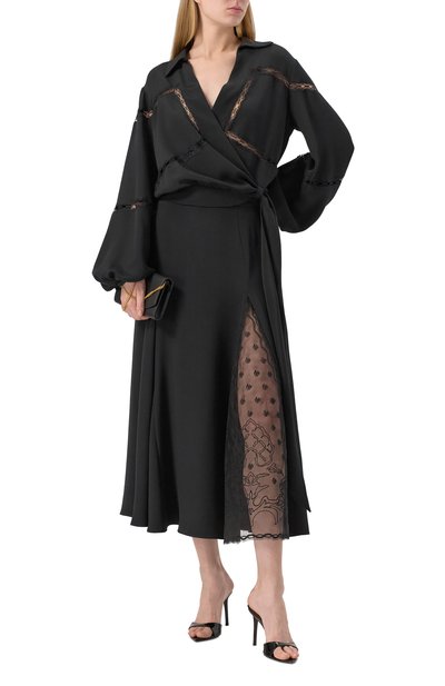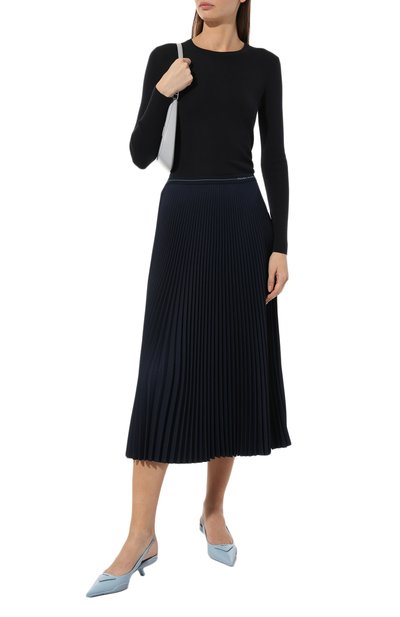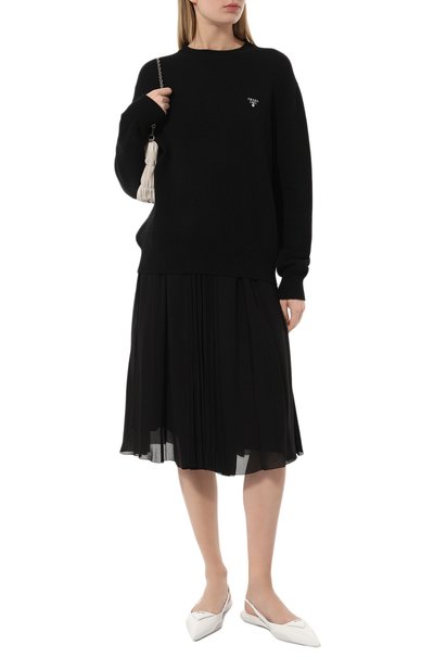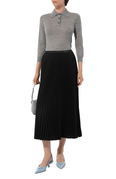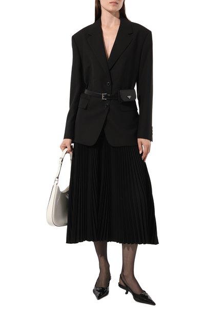 Фактурный нейлоновый ремень с фастексом простился с фирменными сумками и стал поясом на черной миди-юбке. Утилитарная застежка не только ненавязчиво подчеркивает талию, но и фиксирует широкий запах. Он буквально растворяется среди узких складок на струящемся плиссированном текстиле, которые отзываются на каждое движение.