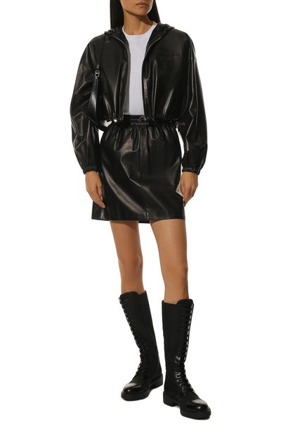 Миучча Прада и Раф Симонс стилизовали черный бомбер под толстовку с капюшоном. Для изготовления слегка укороченной модели с рукавами реглан, словно обтекающими плечи, использовали тонкий трикотаж из нежного кашемира, отлично сохраняющего тепло. Максимальный комфорт в холодную погоду обеспечивает легкий наполнитель из отборного гусиного пуха, который не утяжеляет куртку. Спереди изделие украсили белой жаккардовой эмблемой.