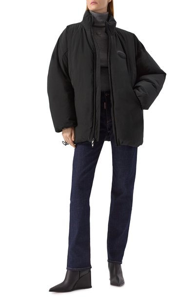 Укороченную куртку на гусином пуху изготовили из плотного хлопкового габардина. Модель со встречной молнией дополнили тремя карманами, а глубокий капюшон — козырьком. Принадлежность изделия марке обозначили треугольной накладкой, обтянутой тканью.