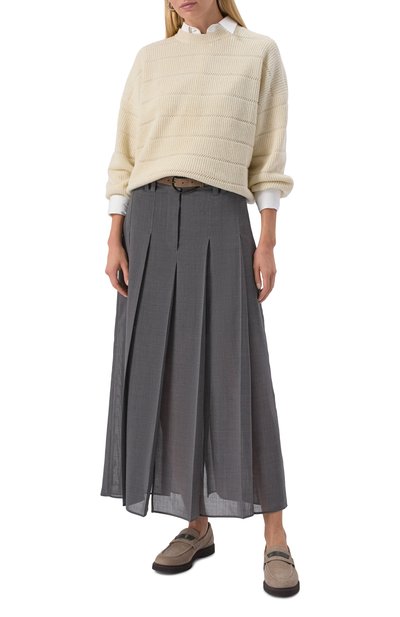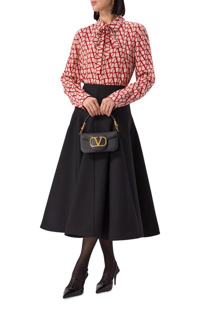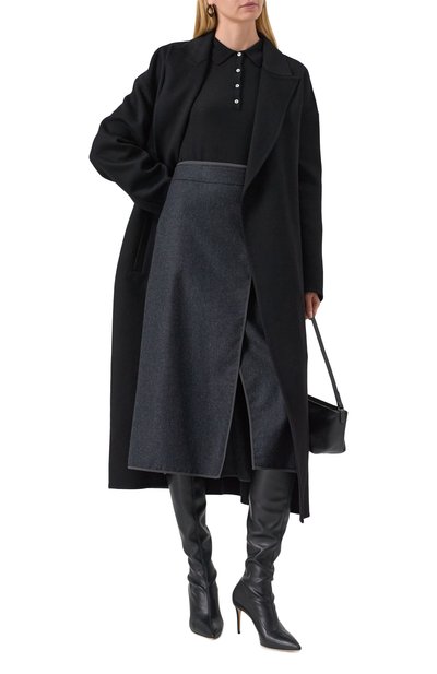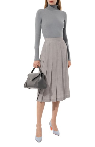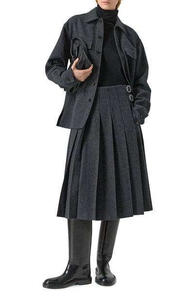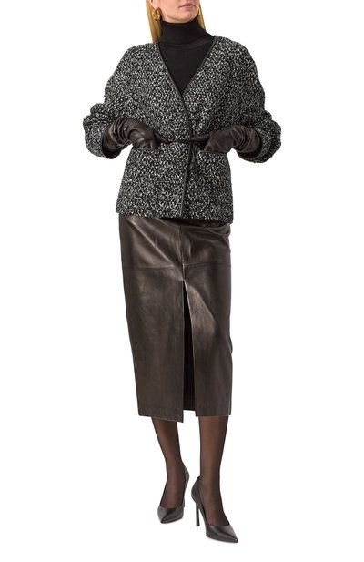 Миучча Прада и Раф Симонс выбрали для пошива черной миди-юбки мягкую полуглянцевую кожу тонкой ручной выделки. Этот слегка эластичный материал легко драпируется, а заложенные складки, формирующие эффект плиссировки, хорошо держат форму и заданную вертикаль. Модель с запахом застегивается текстильными ремешками с серебристыми пряжками фастекс сбоку.