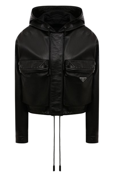 Для изготовления черной куртки с широкой ветрозащитной планкой Миучча Прада и Раф Симонс выбрали мягкую тонкую кожу ягненка. Такой материал легче и эластичнее аналогов, поэтому модель с крупными накладными карманами не ограничивает движения и хорошо драпируется. Модель с регулируемым капюшоном и низом декорировали фирменным эмалевым треугольником.