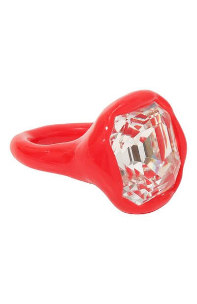 Массивное красное кольцо эффектно искрится в лучах света крупным полупрозрачным кристаллом Swarovski. Его закрепили в аксессуаре, выполненном вручную из пластичной полимерной глины. Чтобы сделать украшение из такого материала прочнее, после обжига модель покрыли глянцевым лаком.