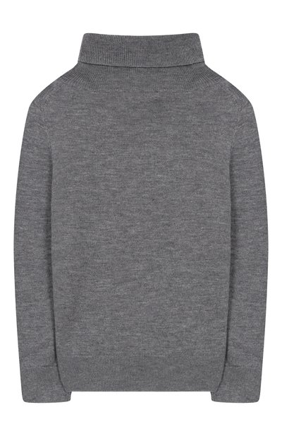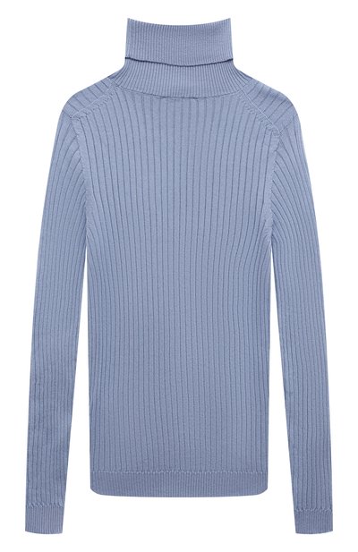 Водолазку выполнили из тонкой мериносовой шерсти. Высокий воротник модели и эластичные манжеты с поясом связали в рубчик. Изделие украсили небольшим вышитым логотипом в тон.