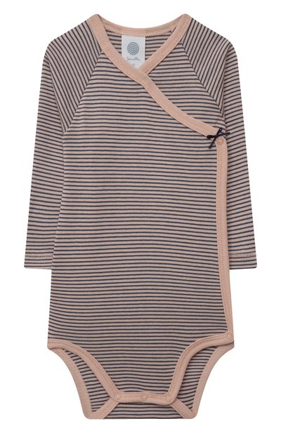 Мастера марки выполнили бежевое боди из мягкого, приятного на ощупь хлопка с полосатым мотивом. Материал из волокон с многослойной структурой хорошо пропускает воздух и не вызывает аллергию. Края изделия с длинными рукавами реглан подчеркнули однотонным кантом.
