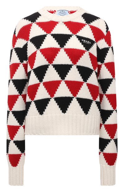 На создание разноцветного свитера Миуччу Праду и Рафа Симонса вдохновила одежда альпинистов. Для изготовления модели они выбрали мягкую кашемировую пряжу, произведенную из нежного пуха горных коз. В вывязанном вручную геометрическом орнаменте зашифровали треугольную эмблему бренда, дополнив один из элементов узора логотипом.