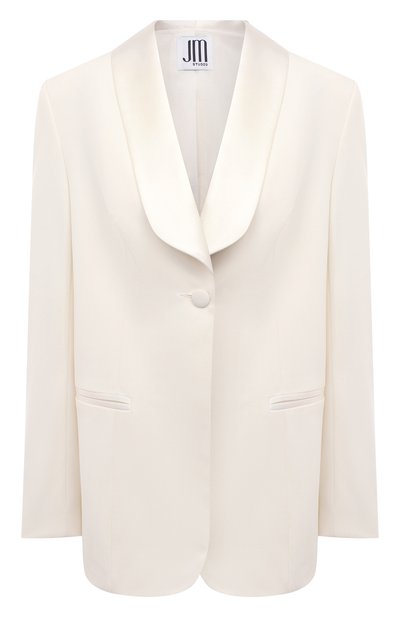 Жакет с четкой линией плеч выполнили из тонкой немнущейся шерсти спокойного молочно-белого оттенка. В такой же цвет окрасили широкие лацканы из мягкого шелковистого текстиля, который деликатно переливается в лучах света и делает изделие наряднее. Эту ткань выбрали и для отделки прорезных карманов спереди.