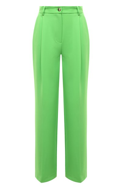 Для пошива зеленых брюк с высокой линией талии мастера марки использовали тонкий плотный, при этом дышащий текстиль на основе вискозы и полиэстера. Изделие из такого материала почти не мнется, а на ощупь напоминает шелковое. Прямая модель с крупными защипами, переходящими в складки, комфортно садится по фигуре.