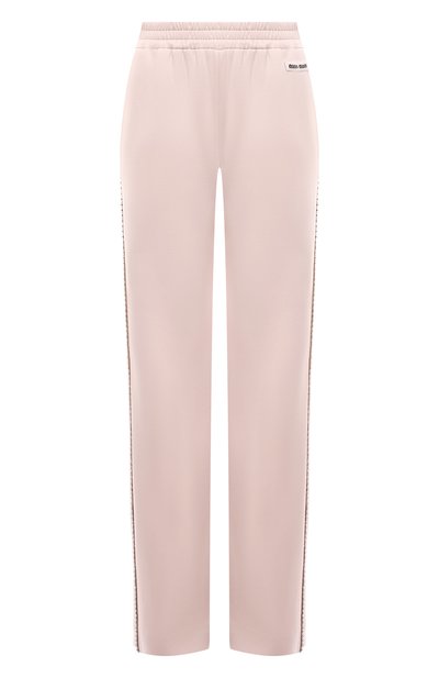 Для пошива светло-розовых прямых брюк с широким поясом и двумя врезными карманами Миучча Прада выбрала гладкий шелковистый трикотаж на основе хлопка, который отлично пропускает воздух и не теряет форму со временем. На бедре — небольшой патч с логотипом марки. Однотонная модель украшена узкими лампасами из сверкающих кристаллов.