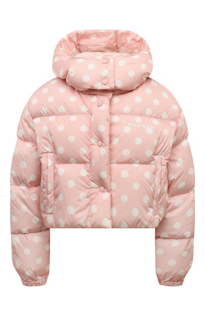Короткий розовый пуховик в крупный белый горох мастера марки сшили из тонкого, при этом плотного нейлона, защищающего от ветра. Из такой же ткани выполнили объемный капюшон, который можно отстегнуть. Модель, застегивающуюся молнией и кнопками, утеплили слоем отборного гусиного пуха с небольшим добавлением пера.