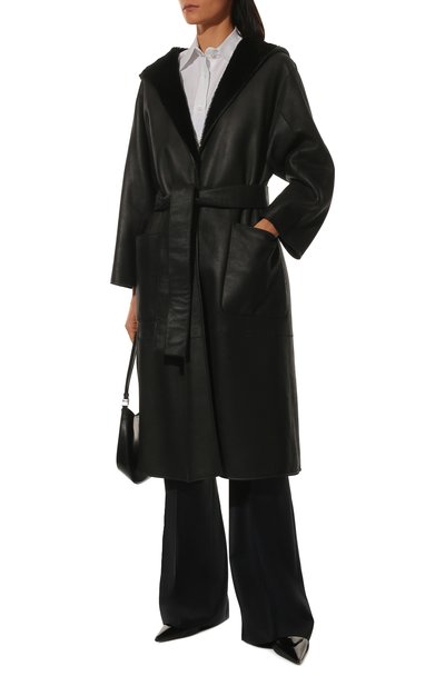 Черной дубленке привили гены пуховика: рукава и капюшон с пушистой оторочкой выполнили из шелковистого текстиля с объемным стеганым мотивом. Для изготовления модели мастера марки, основанной Марио Прада, использовали тонкую овчину, искусно подстриженную под плюш, а для отделки – прочный материал Econyl. Его произвели из переработанного пластикового мусора и списанных рыболовных сетей, чтобы сократить углеродные выбросы и количество вредных отходов.