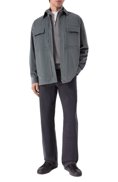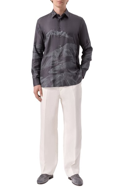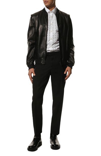 Миучча Прада разнообразила белую рубашку классического прямого кроя, украсив ее россыпью миниатюрных заклепок, создающих легкое мерцание. Для пошива модели использовали тонкий шелковистый хлопок. О принадлежности марке деликатно говорит узнаваемый треугольный элемент, которым дополнили накладной карман.