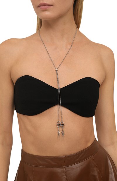 Колье Personal Jesus в виде двойной цепочки якорного плетения дополнили вставками и подвесками-крестами, инкрустированными черной шпинелью. Регулируемый по длине аксессуар из ювелирного сплава застегивается замком-карабином.