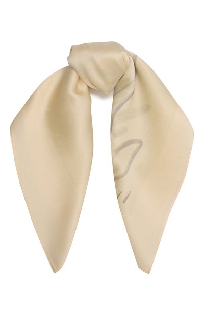 Бежевый квадратный платок можно повязать на шею, на запястье, как браслет, или обернуть им ручку любимой сумки. Аксессуар с крупным логотипом бренда, словно написанным простым карандашом от руки, создали из нежного шелка. Исключительно приятный на ощупь материал обладает благородным блеском, который не потеряется со временем.