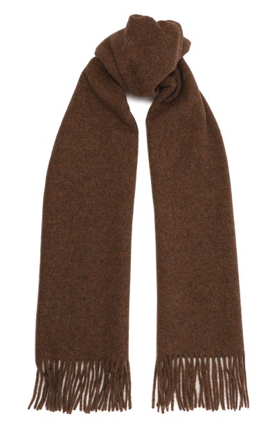 Меланжево-коричневый шарф изготовили из мягкой тонкой шерсти. Этот материал со множеством воздушных микрополостей внутри многослойных волокон поддерживает оптимальную температуру, а его фактурная поверхность служит преградой для ветра. Края аксессуара декорировали бахромой.