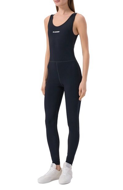 Черный комбинезон с вырезом халтер выполнили из эластичного непрозрачного трикотажа. Особенно плотное продольное переплетение нитей сделало материал прочным и шелковистым на ощупь, а изделие из него облегает фигуру, словно вторая кожа, не мешая при этом свободно двигаться. Ажурные вставки с жаккардовым узором в виде эмблемы визуально моделируют силуэт.