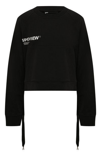 Укороченный силуэт черного свитшота дизайнеры марки противопоставили немного удлиненным рукавам реглан, которые драпируются небольшими складками. Для пошива модели использовали плотный, при эт ом мягкий хлопок. Изделие украсили спереди белым брендированным принтом, который перекликается с широкими лентами по бокам.