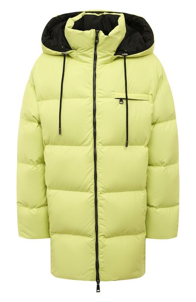 Объемный, но при этом легкий светло-зеленый пуховик со съемным регулируемым капюшоном сшит из гладкого матового нейлона с шелковистой текстурой. По бокам — открытые врезные карманы, на груди — застегивающийся молнией. Однотонная стеганая куртка утеплена отборным гусиным пухом с небольшим добавлением пера.