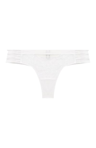 При создании белых стрингов использовали сочетание полупрозрачной сетки и тончайшего кружева Leavers с цветочным мотивом, поэтому они почти ничего не весят и не ощущаются на теле. Узким эластичным лентам по бокам, заменившим пояс, вторят такие же петли, закрепленные на серебристой U-образной детали сзади.