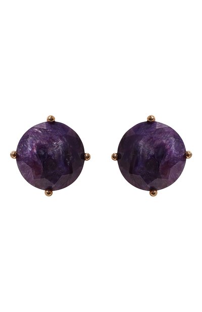В миниатюрных пусетах главную роль отдали фиолетовым вставкам из чароита. Его неповторимый узор делает каждое изделие уникальным. Мерцающий камень бриллиантовой огранки поместили в крапановую закрепку, которая не перекрывает его. Для создания основы серег использовали серебро 925 пробы с розовой позолотой.